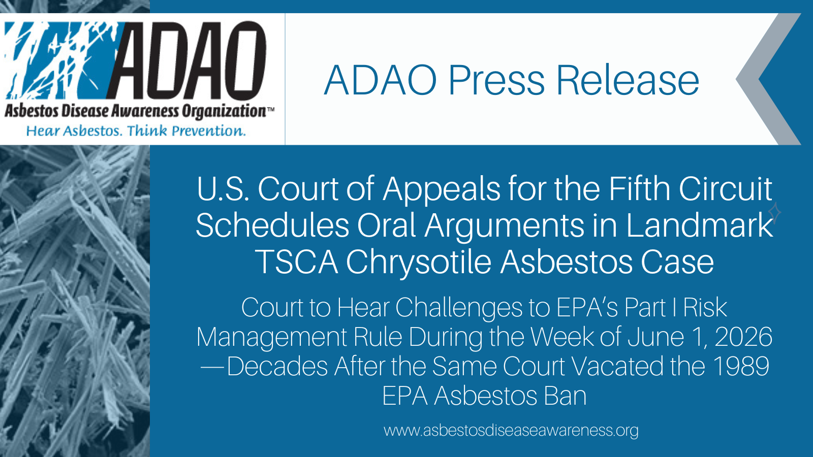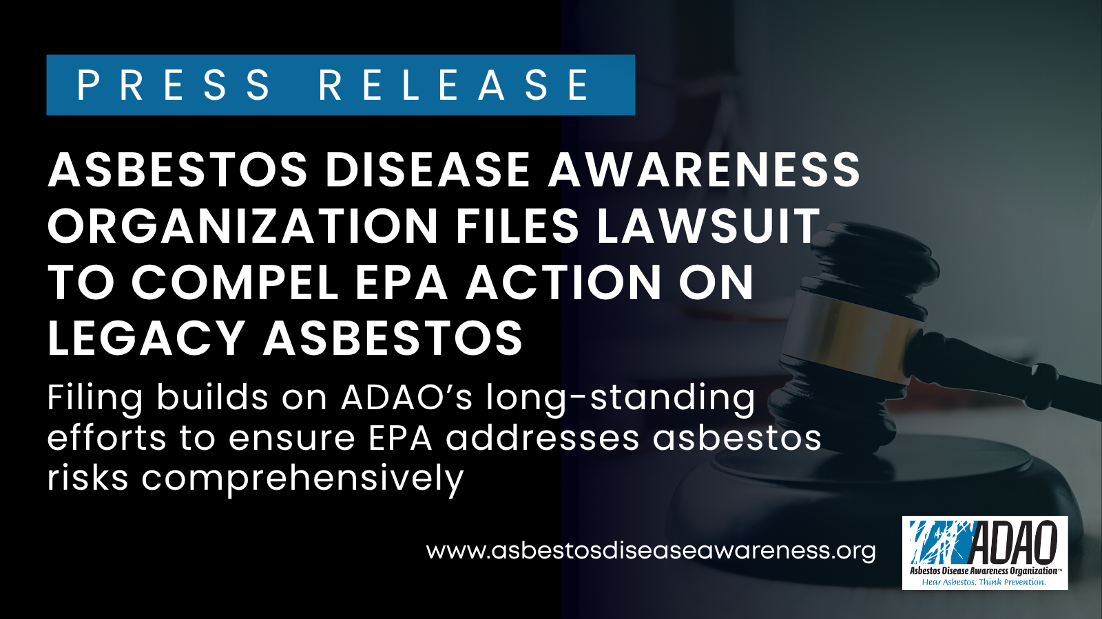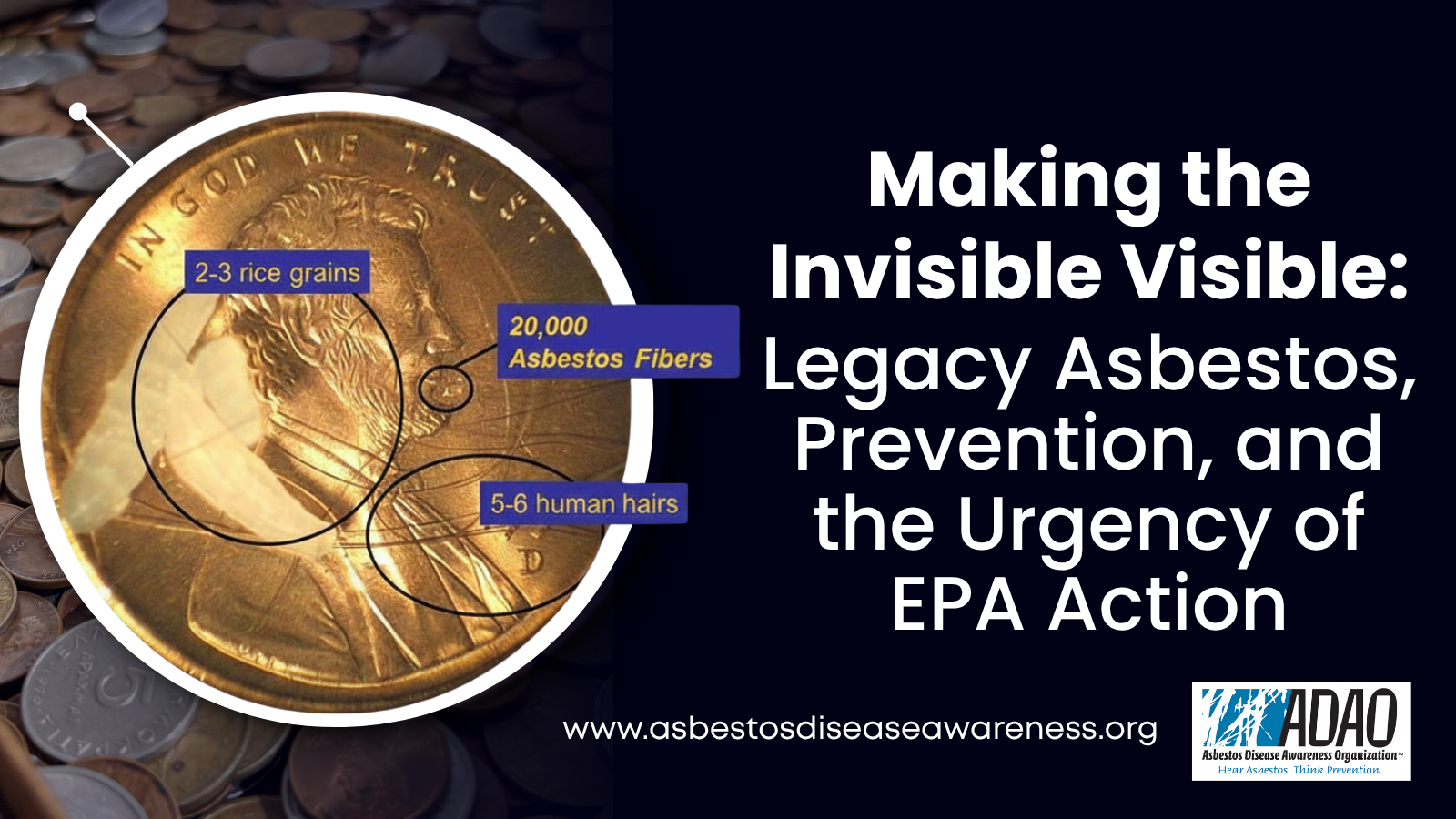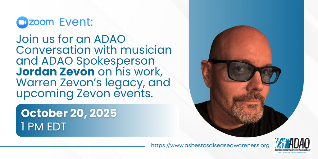 The Asbestos Disease Awareness Organization (ADAO) is the largest independent asbestos victims’ organization in the U.S. It was founded in 2004 to give asbestos victims and concerned citizens a united voice, to raise public awareness about the dangers of asbestos exposure and to work towards a global asbestos ban. ADAO is dedicated to preventing consumer, environmental and occupational asbestos-caused diseases through national and international education, advocacy, and community initiatives. Read more about ADAO and “Who We Are”.
