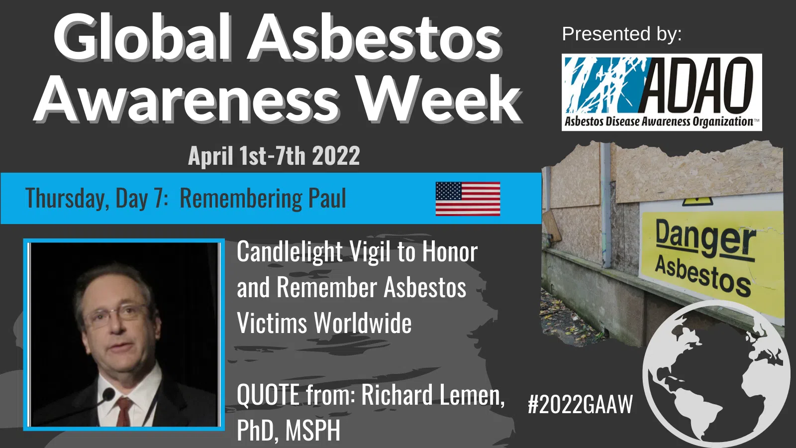 Today, on day seven of GAAW, we hold a candlelight vigil in honor and remembrance of the countless victims who have been silenced by asbestos worldwide. We remember Paul, and share his story, “Dust into Gold: Banning Asbestos Is Good Business.” Paul was a remarkable friend and brave Warrior, who, for more than a decade, valiantly used his voice to fight for an asbestos ban and civil justice. PBS NewsHour highlighted Paul’s powerful story in 2019 with their excellent segment: “The stunning truth about asbestos use in the U.S.” by Miles O’Brien.