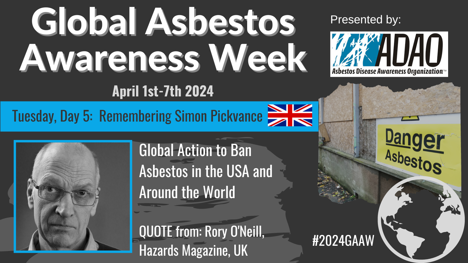 Day Five of Global Asbestos Awareness Week marks a pivotal shift in our campaign focus towards “Global Action to Ban Asbestos in the USA and Around the World.” Today, we shine a spotlight on the relentless advocacy of Simon Pickvance from the UK, whose tireless efforts to expose the deadly risks of asbestos in the workplace have illuminated our path forward. Dive into Simon’s inspiring saga in “The man who exposed how work can kill,” a gripping account that underscores the urgent need for collective action against asbestos.
