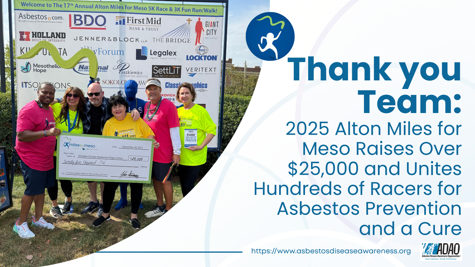 This year’s Miles for Meso raised over $25,000 for ADAO, directly funding our work in education, community support, and policy advocacy. Since 2014, proceeds from the Alton race alone have sustained critical programs that empower families, push for prevention, and fuel our mission to secure a full ban on asbestos.