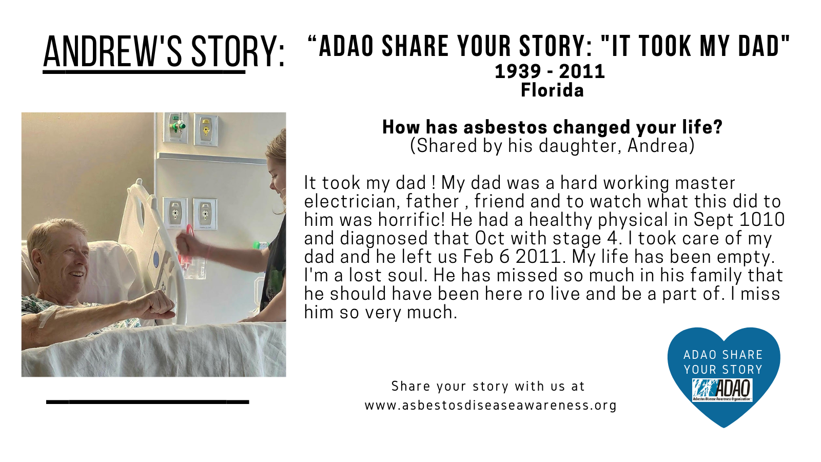 We have been touched by asbestos in individual ways, yet we are joined together by a bond of community. As a testament to the strength of our global family, the Asbestos Disease Awareness Organization (ADAO) is highlighting the courageous stories of our members with the “Share Your Story” feature on our website.’