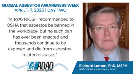 Despite decades of scientific warnings, asbestos continues to be used and imported in the United States. As Dr. Richard Lemen, former Assistant Surgeon General and ADAO Science Advisory Board Co-Chair, reminds us: “Thousands continue to be exposed and die from asbestos-related diseases.” These deaths persist despite a national ban being recommended nearly fifty years ago.