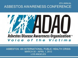Manhattan Beach, Calif. – The Asbestos Disease Awareness Organization (ADAO) is hosting its 8th Annual International Asbestos Awareness Conference Friday, March 30 – April 1, 2012, in Manhattan Beach, Calif., with activities planned throughout the weekend. The international conference provides education and outreach to families, employers/employees and scientists on a global scale as part of ADAO’s continuing effort to educate the public about the dangers of asbestos, ban its use, and encourage research efforts to improve treatment options.