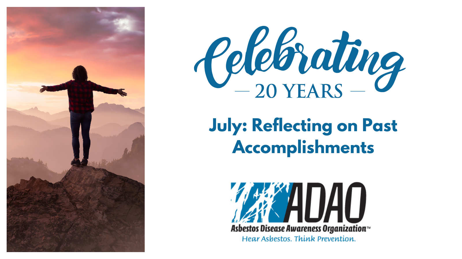 As we celebrate the 20th Anniversary of the Asbestos Disease Awareness Organization (ADAO) this July, we take a moment to reflect on our journey, our accomplishments, and the significant challenges we have faced to prevent exposure and eliminate all asbestos-caused diseases.