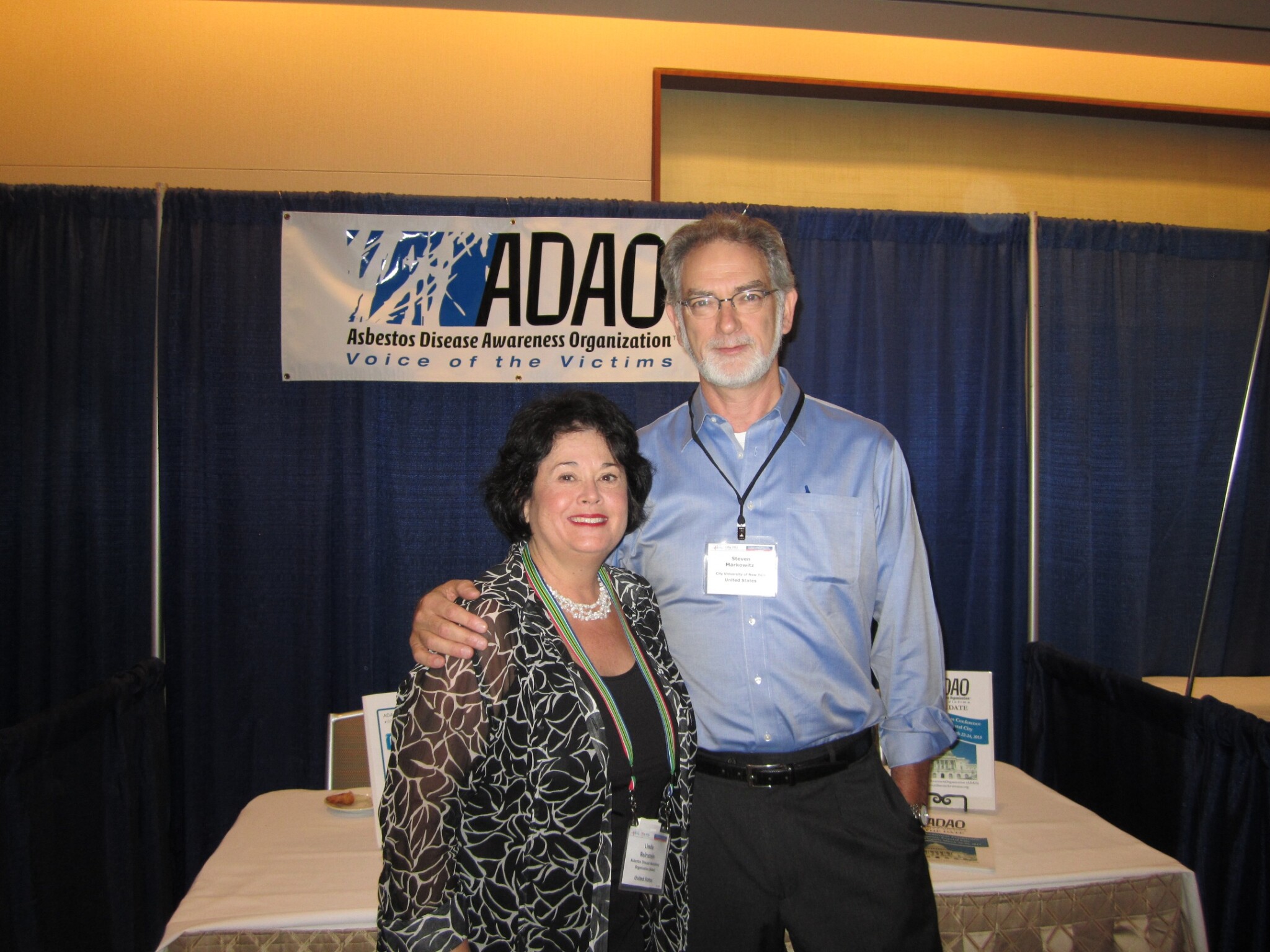 I began the day by attending two sessions, “Surgical Treatment” and “Surgery for Mesothelioma,” presented by Drs. David Sugarbaker, Raja Flores, David Rice, Kazunori Okabe, David Jablons, Paul Sugarbaker and several others. The presenters discussed the current status Linda Reinstein and Dr. Steven Markowitz at iMig of surgery for pleural and peritoneal mesothelioma and the pros and cons associated with the surgery and multi-modality adjuvant and neoadjuvant therapy. The lively EPP, EPD, or no surgery debate continues. However, an inarguable fact is that mesothelioma patients need to seek treatment from a center of excellence that has both experience and a multidisciplinary team approach for treatment.