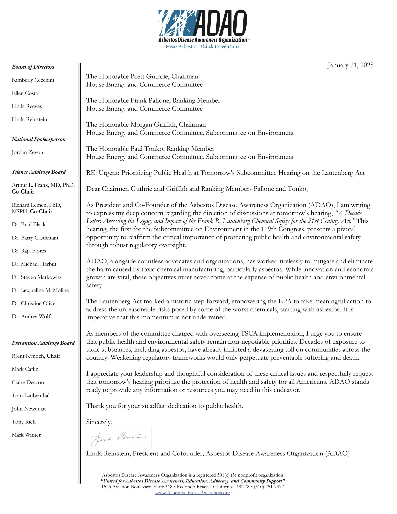 On behalf of the Asbestos Disease Awareness Organization (ADAO), I extend my deepest gratitude to Ranking Members Paul Tonko and Frank Pallone for their unwavering leadership in prioritizing public health. Their commitment to environmental safety and chemical reform remains an inspiration and exemplifies the bipartisan action needed to tackle these critical challenges.