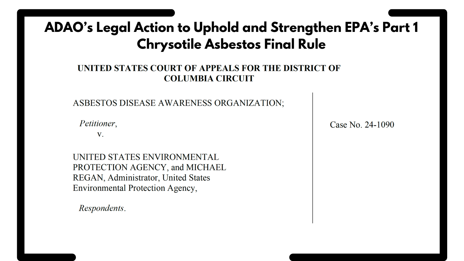 April 22, 2024 Release: ADAO FILES PETITION IN DC CIRCUIT COURT TO STRENGTHEN EPA’S PART 1 CHRYSOTILE ASBESTOS RULE, ADVOCATING FOR COMPREHENSIVE PUBLIC HEALTH PROTECTIONS