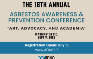 Posted on May 16, 2023 The Asbestos Disease Awareness Organization (ADAO) will host our Annual Asbestos Awareness and Prevention Conference, Exploring the Intersection of Art, Advocacy, and Academia, on September 9, 2023, at the AFL-CIO Headquarters [...]