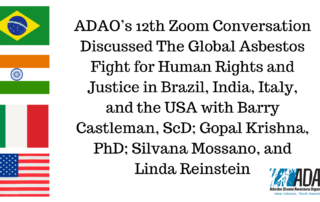 ADAO’s 12th Zoom Conversation Discussed The Global Asbestos Fight for Human Rights and Justice in Brazil, India, Italy, and the USA with Barry Castleman, ScD; Gopal Krishna, PhD; Silvana Mossano, and Linda Reinstein