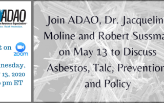 ZOOM EVENT: Join ADAO, Dr. Jacqueline Moline and Robert Sussman to Discuss Asbestos, Talc, Prevention, and Policy on May 13