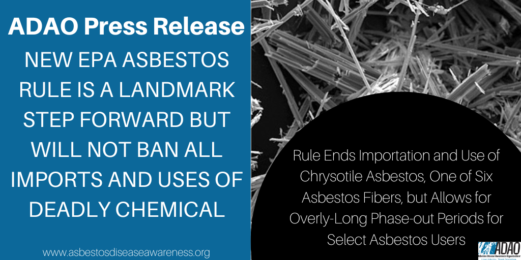 “We commend EPA for finalizing the Part 1 rule banning the importation and use of chrysotile asbestos, one of six deadly asbestos fibers, for six conditions of use. Closing the door to chrysotile imports is a historic step, but the EPA rule does not restrict importation and use of five other recognized asbestos fibers,” said Linda Reinstein, co-founder and president of ADAO.