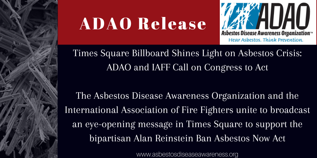 The Asbestos Disease Awareness Organization and the International Association of Fire Fighters unite to broadcast an eye-opening message in Times Square to support the bipartisan Alan Reinstein Ban Asbestos Now Act.