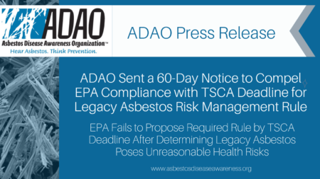“The legal battle to get EPA to step up to addressing the serious health risks of legacy asbestos has been a long journey and it still isn’t over.,” said Robert M. Sussman, counsel for ADAO. “EPA has once again failed to act on legacy asbestos in the face of a clear mandate from Congress to propose a rule within one year of determining that legacy asbestos presents an unreasonable risk. Congress used mandatory language—‘shall propose.’ This is a statutory duty, not a matter of discretion and ADAO intends to enforce the law.”
