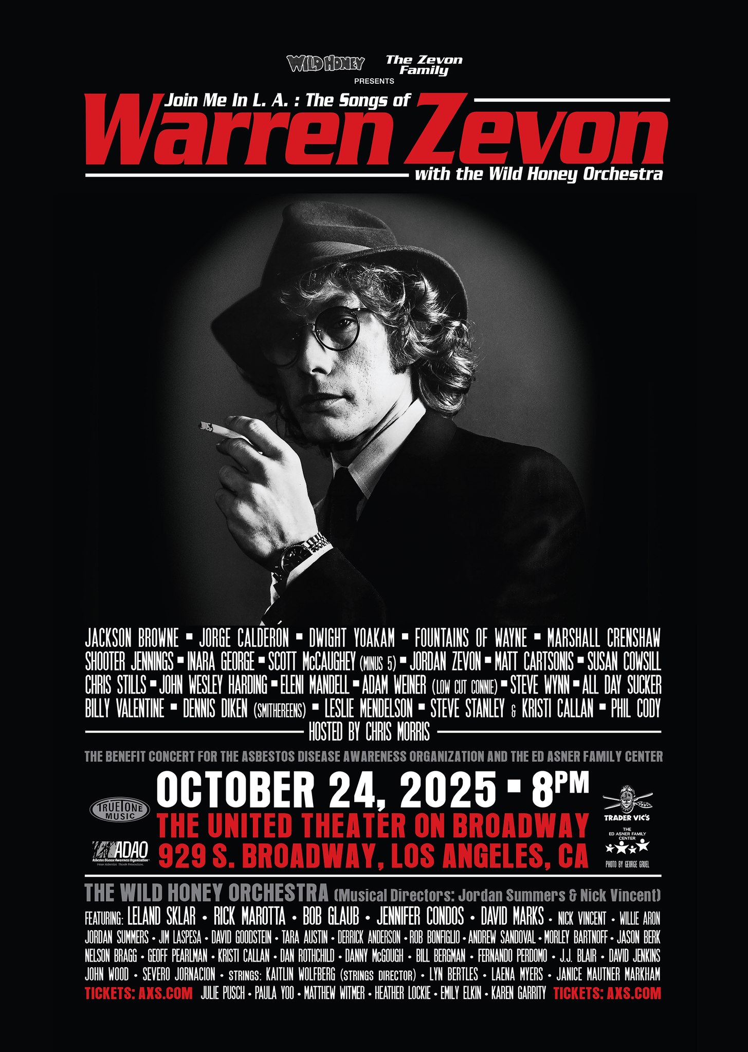 The Zevon Family and the Wild Honey Foundation present Join Me in L.A.: The Songs of Warren Zevon, a powerhouse tribute celebrating the life, music, and legacy of the late Warren Zevon. The concert will feature Jackson Browne, Dwight Yoakam, Jorge Calderón, Fountains of Wayne, Marshall Crenshaw, Shooter Jennings, Jordan Zevon, and many more, backed by the renowned Wild Honey Orchestra.