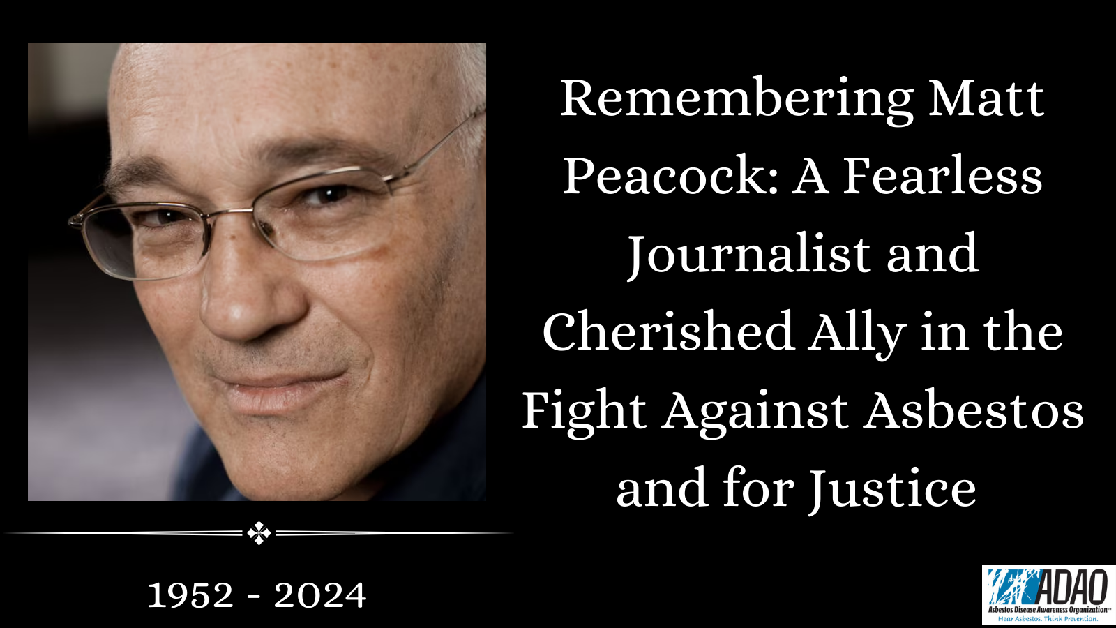 The Asbestos Disease Awareness Organization (ADAO) mourns the passing of Matt Peacock, an extraordinary journalist, advocate, and dear friend, who left us on October 30, 2024, at the age of 72. For over 40 years, Matt dedicated his career to fearless investigative journalism, primarily with the Australian Broadcasting Corporation (ABC). He began as a current affairs television researcher and soon became a pioneering reporter with the ABC Radio Science Unit, where he produced the groundbreaking series Asbestos: Work as a Health Hazard, one of the first to expose the profound dangers of asbestos.