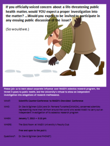 In addition to McGill’s refusal to allow an independent investigation of this complaint, McGill is holding a Seminar on January 7, 2013 at which Dr. Bruce Case of McGill’s Department of Epidemiology and a former colleague of Prof. McDonald will apparently present still another defense of McGill’s asbestos research. Dr. Case claims to possess the missing data related to this research, but refuses to make the data public.
