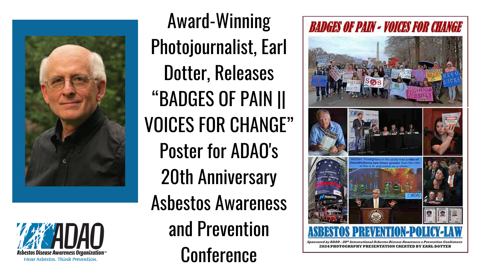 The Asbestos Disease Awareness Organization (ADAO) is thrilled to unveil its 2024 poster, designed by the renowned photographer Earl Dotter, for the 20th Anniversary Asbestos Awareness and Prevention Conference (AAPC). Titled “BADGES OF PAIN || VOICES FOR CHANGE,” this poster poignantly represents our ongoing fight against asbestos-related diseases and our relentless push for policy reform.
