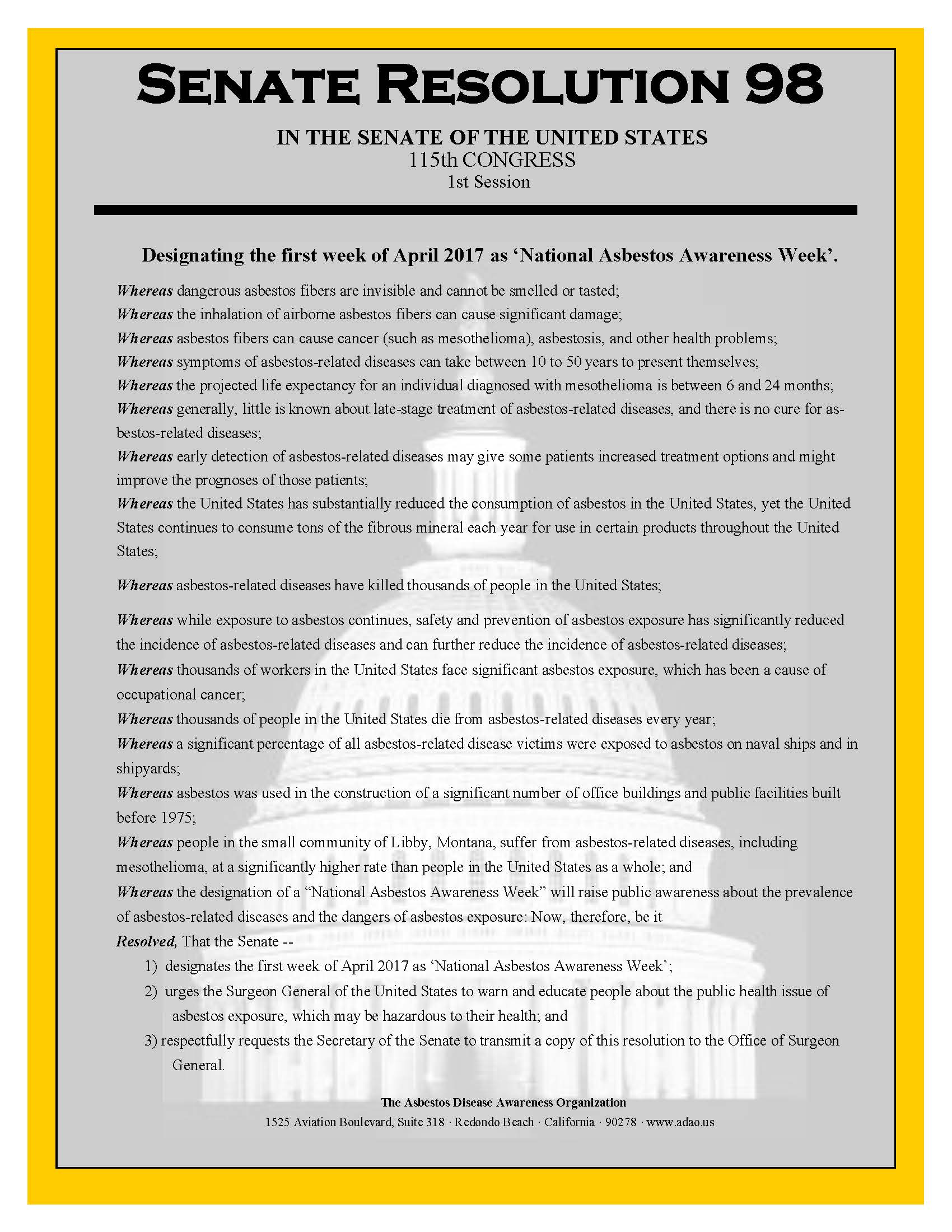 In 2005, U.S. Senate Majority Leader Harry Reid offered to champion ADAO’s request for the first Asbestos Awareness Day. Our organization was exhilarated, but challenged, as we began to draft the language for the first Resolution. When the resolution passed unanimously in the Senate, our celebration could have been heard around the world.