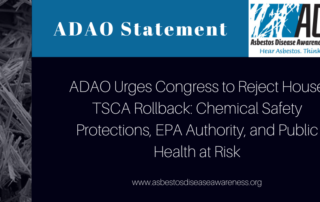 FOR IMMEDIATE RELEASE Posted on January 30, 2026 Statement: ADAO Urges Congress to Reject House TSCA Rollback: Chemical Safety Protections, EPA Authority, and Public Health at Risk The Asbestos Disease Awareness Organization (ADAO) strongly opposes [...]