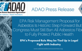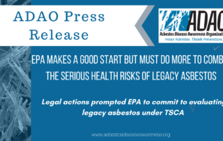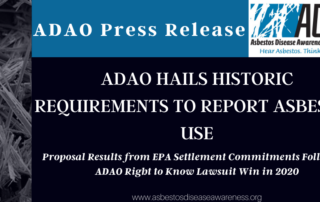 FOR IMMEDIATE RELEASE May 5, 2022 ADAO HAILS HISTORIC REQUIREMENTS TO REPORT ASBESTOS USE Proposal Results from EPA Settlement Commitments Following ADAO Right to Know Lawsuit Win in 2020 Washington, DC. — The Asbestos Disease [...]