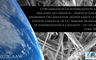 L’Organisation de Sensibilisation aux Maladies de l’Amiante / Asbestos Disease Awareness Organization (ADAO) lance la 18e édition annuelle de la ” Semaine Mondiale de Sensibilisation à l’Amiante “, du 1er au 7 avril 2022