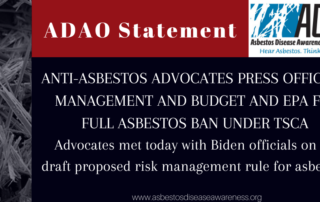 FOR IMMEDIATE RELEASE January 11, 2022 ANTI-ASBESTOS ADVOCATES PRESS OFFICE OF MANAGEMENT AND BUDGET AND EPA FOR FULL ASBESTOS BAN UNDER TSCA Advocates met today with Biden officials on the draft proposed risk management rule [...]