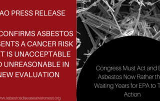 FOR IMMEDIATE RELEASE March 31, 2020 EPA CONFIRMS ASBESTOS PRESENTS A CANCER RISK THAT IS UNACCEPTABLE AND UNREASONABLE IN NEW EVALUATION Congress Must Act and Ban Asbestos Now Rather than Waiting Years for EPA to [...]