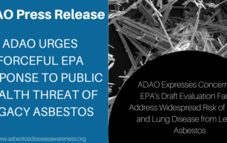 ASBESTOS DISEASE AWARENESS ORGANIZATION URGES FORCEFUL EPA RESPONSE TO PUBLIC HEALTH THREAT OF LEGACY ASBESTOS ADAO Expresses Concern that EPA’s Draft Evaluation Fails to Address Widespread Risk of Cancer and Lung Disease from Legacy Asbestos [...]