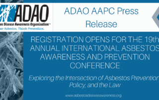 Register for the 2024 Conference FOR IMMEDIATE RELEASE July 22, 2024 REGISTRATION OPENS FOR THE ASBESTOS DISEASE AWARENESS ORGANIZATION 20TH ANNIVERSARY ASBESTOS AWARENESS AND PREVENTION CONFERENCE ADAO’s Annual Conference Focuses on the Intersection of Asbestos [...]