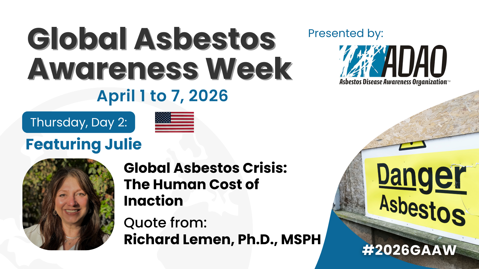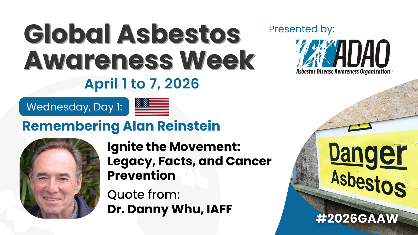 Landing Page for #2026GAAW Global Asbestos Awareness Week || Asbestos: One Word. One Week. One World. April 1 – 7, 2026